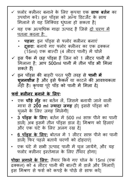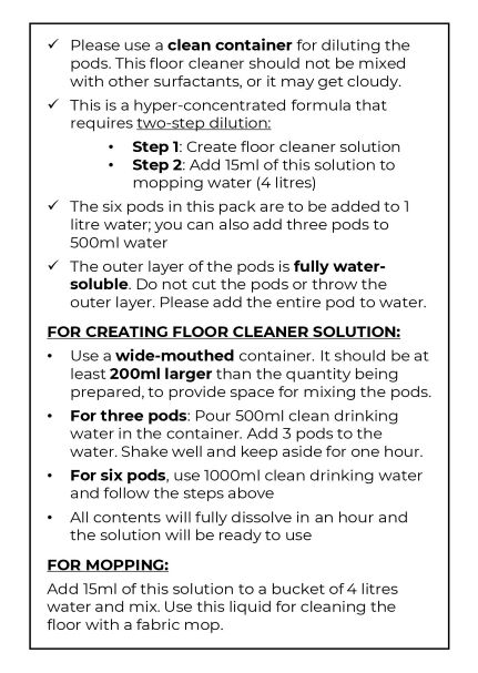 USE: Their outer cover is made up of polyvinyl alcohol (PVA/PVOH), which dissolves in water, releasing the concentrate inside. In about an hour, a clear, fragrant solution is ready, which you can use as usual i.e. adding 15ml of it into a bucket of 4 litres of water to mop the floor. Please refer to the leaflet inside for detailed instructions on mixing; the images on the left will help you get an idea as well.
