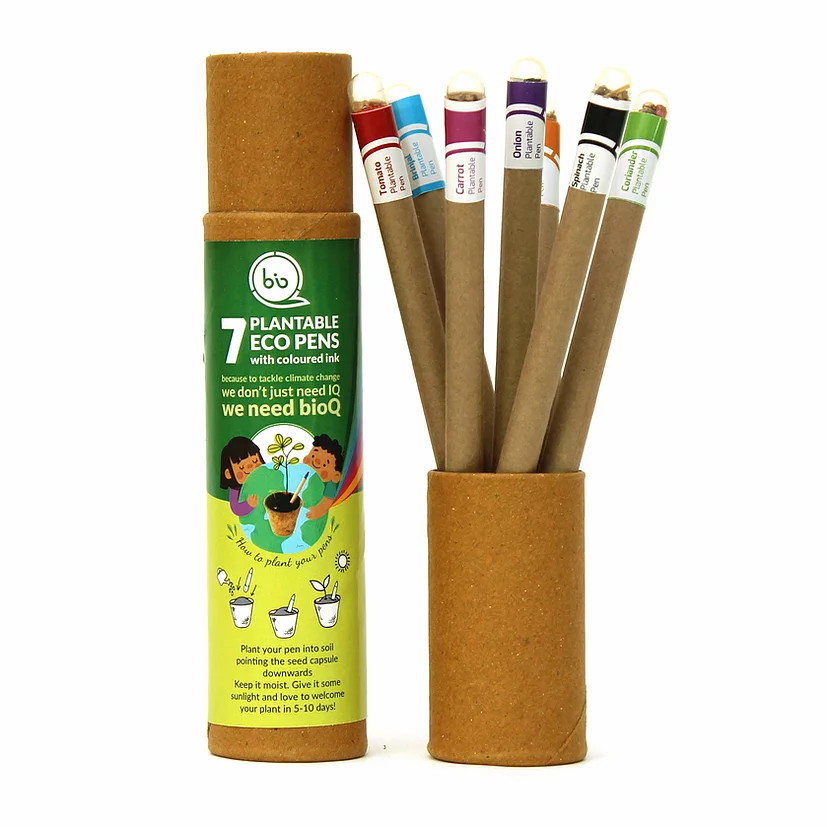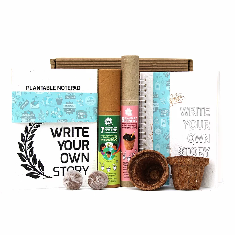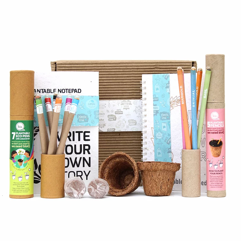 The product includes: 1 box of 7 Colouring Seed Pen, 1 box of 5 Seed Pencil , 2 plantable notepad , and 2 planting kits to start planting all packed in an eco-friendly box
