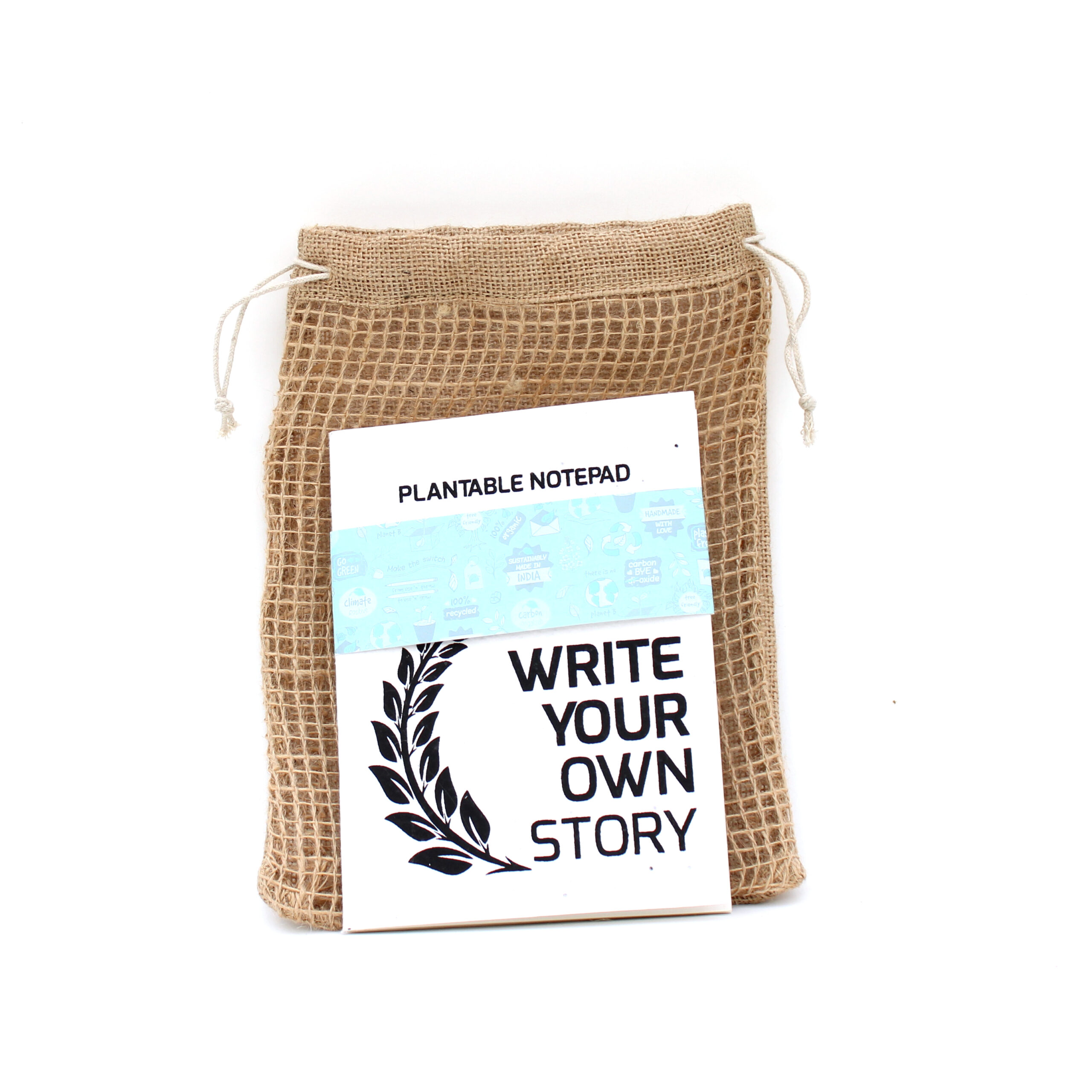 The Premium PlantableĀ  Jute Kit consists of 1 plantable notepad, 5 plantable coloured ink paper pens and 5 premium plantable pencils with flower seeds, together packaged in a one-side netted jute bag with a drawstring.