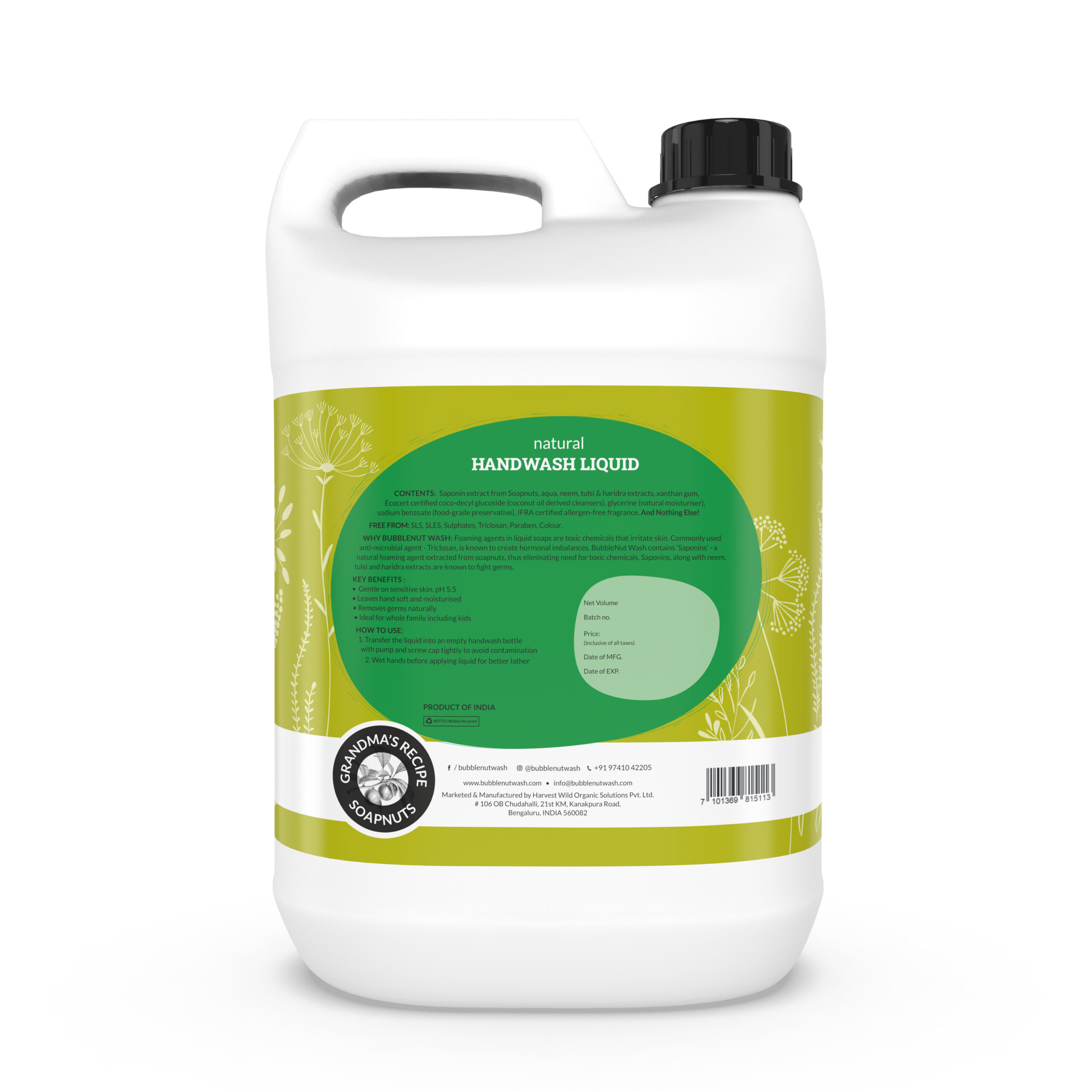 One can containing BubbleNut Wash Natural Hand Wash Liquid of 5L