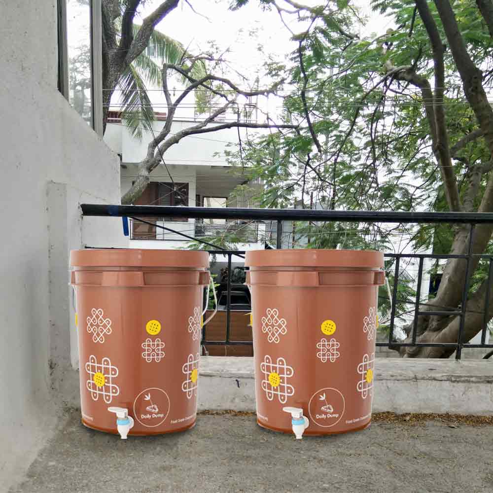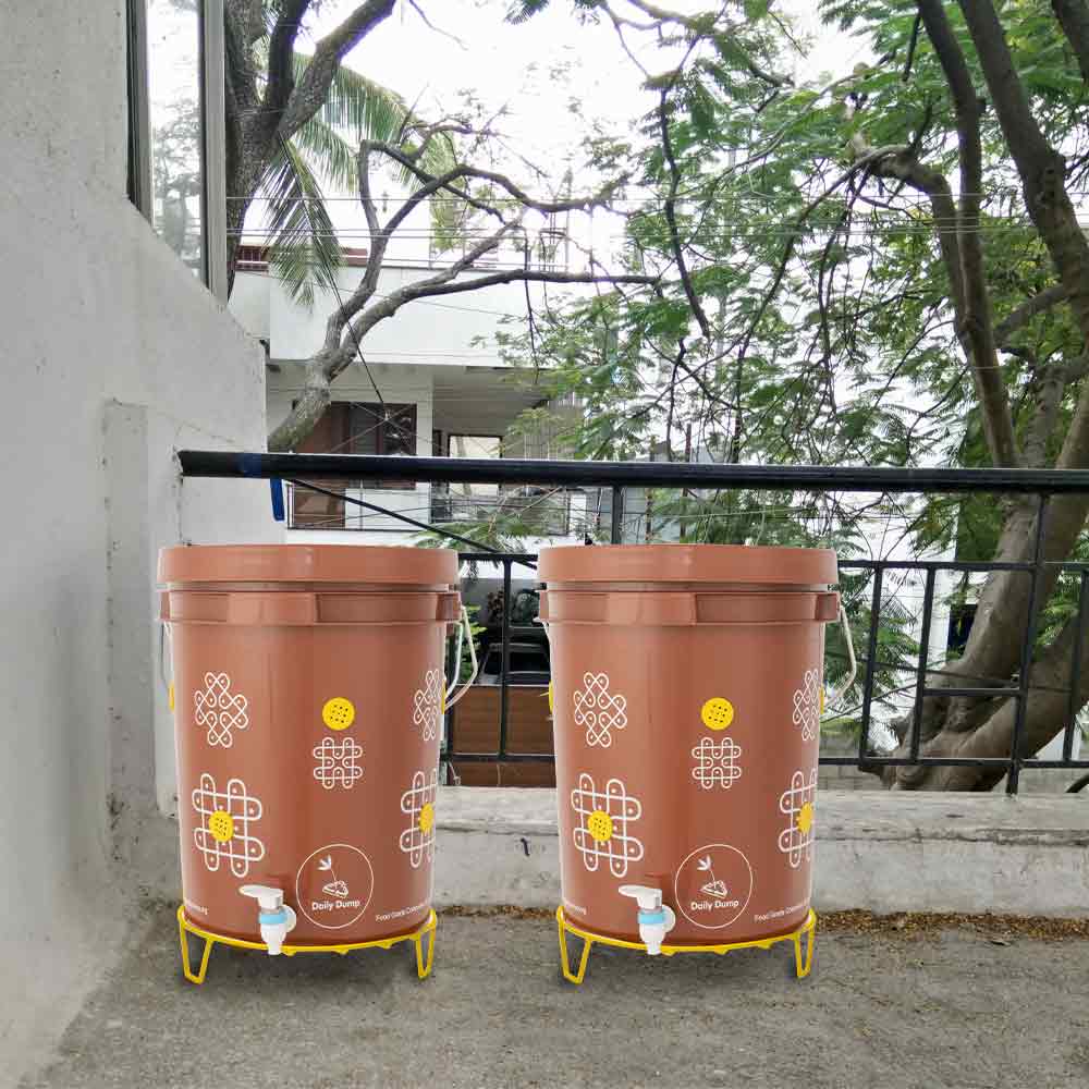 Two Chomp unit each of 20 litre capacity and dimensions 12″ dia x 20″ height . Each Chomp comes without stand, Remix Powder(2 kg) , a set of Gloves, microbes powder , neem powder, 1 Bin with lid, tap, separator, 2 washers, stand(as per your selection), and an instruction sheet.