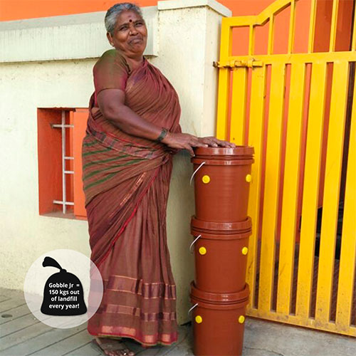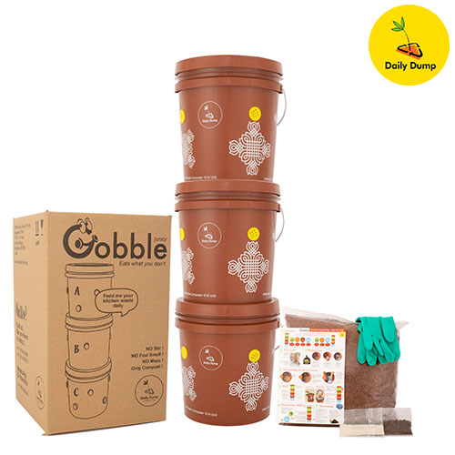 Each Junior unit is of 10 kgs capacity and dimensions 25.5 cm dia x 91.5 cm height. Each Gobble Junior comes with a pair of gloves, Remix Powder(1kg) , microbes powder, neem powder, 3 units with lids and an instruction sheet.