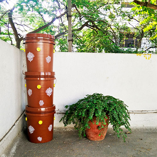 The Gobble Junior composter is designed for small families of 2 to 3 people or persons living alone. It can handle about half a kilo of waste everyday and is very light and easy to shift around. Fits into tight spaces. Layer your kitchen waste with Remix Powder daily for smell free and fool proof composting. If you are using Remix, you do not need to stir daily. Comes with a instruction sheet on how to use.