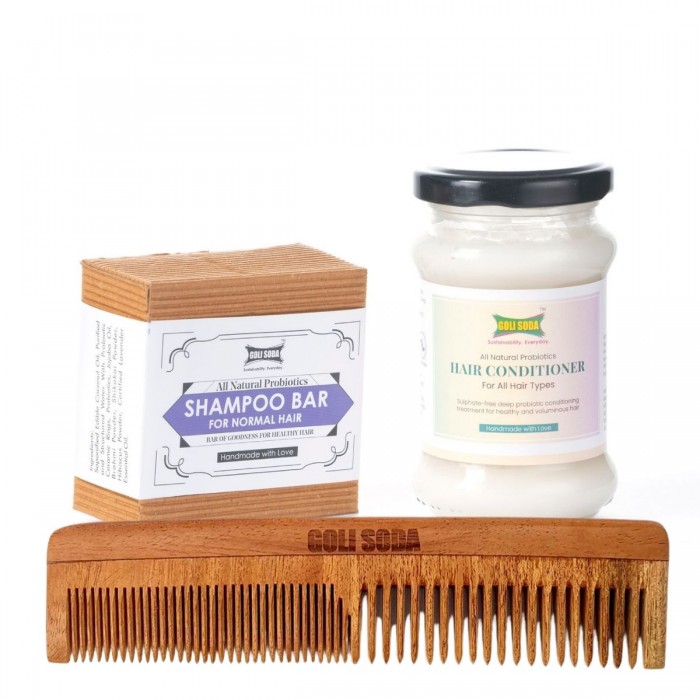 This set includes a natural probiotics conditioner(130gm), shampoo bar & a neem wood comb – Double Tooth