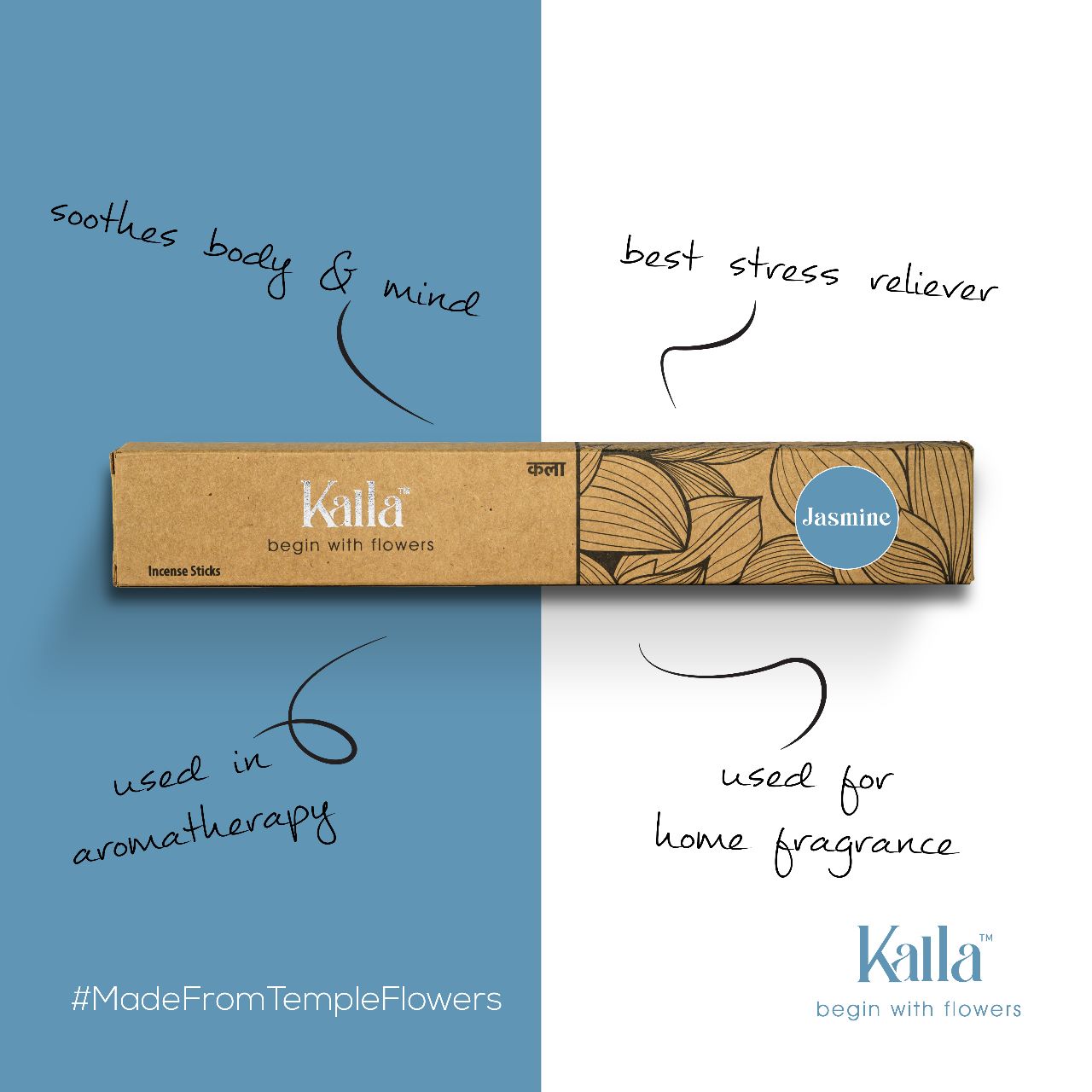 Kalla natural Jasmine incense sticks have calming therapeutic properties that naturally calm the mind & body. Kalla Jasmine luxury incense sticks are widely used in aromatherapy for pain and healing to rejuvenate your body and soul. Jasmine is also commonly used for home fragrance, Meditation, and in Spa.