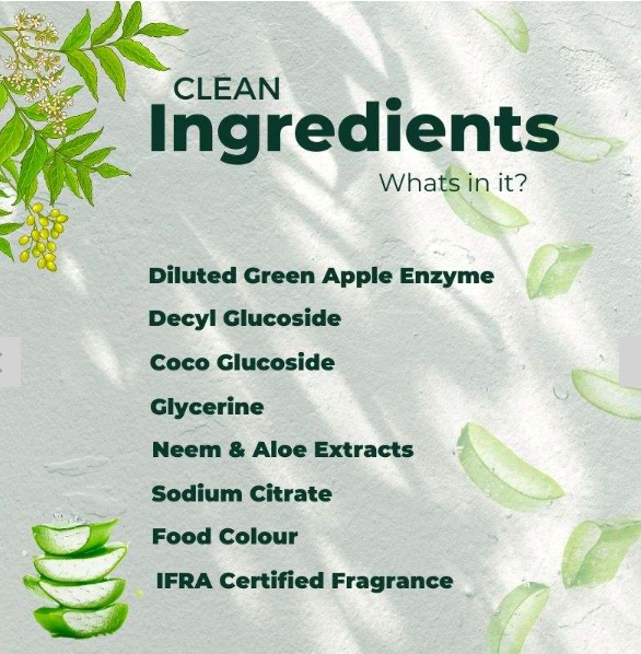 Ingredients :Diluted Bio Enzyme, Decy Glucoside, Coco Glucoside, Glycerine, Neem and aloe Extract, Sodium Citrate, Food Colour, IFRA certified Fragrance.