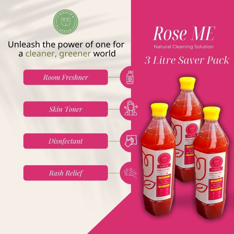 Rose ME is an entirely natural ,organic and chemical free, multipurpose cleaner for your homes which not only does its job but also as a by product ends up cleaning the environment once it goes down the drain. The microbes in bio-enzymatic cleaners are able to reach very small cracks and crevices on surfaces, which means they can eliminate soiling and malodors that traditional chemicals often cannot. Its concentrated and needs to be diluted before use.