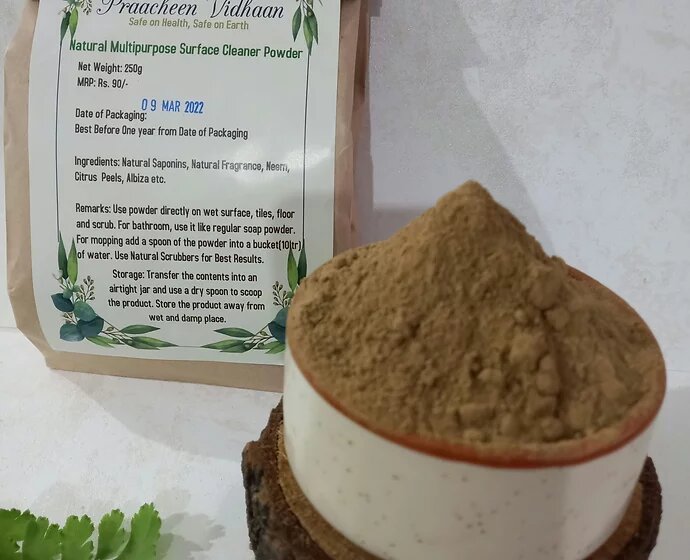 The natural multi surface cleaning powder is made of naturally occurring saponins powder from berries & pods and contains active cleaning agents(citrus peels), along with antibacterial and antifungal powders from natural herb neem, with added natural fragrance.