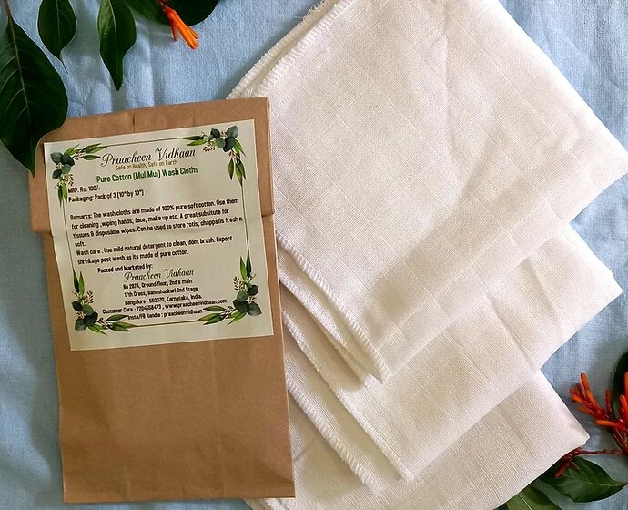 The washcloths are made of 100% pure soft cotton. Use them for cleaning, wiping hands, face, make up etc. A great substitute for tissues & disposable wipes. Use them for cleaning & wiping hands, face, make up, to store rotis and chapatis fresh and soft, to steam idly, as wash cloth for kids and infants, to wrap and carry jewelry, watch, glasses etc.