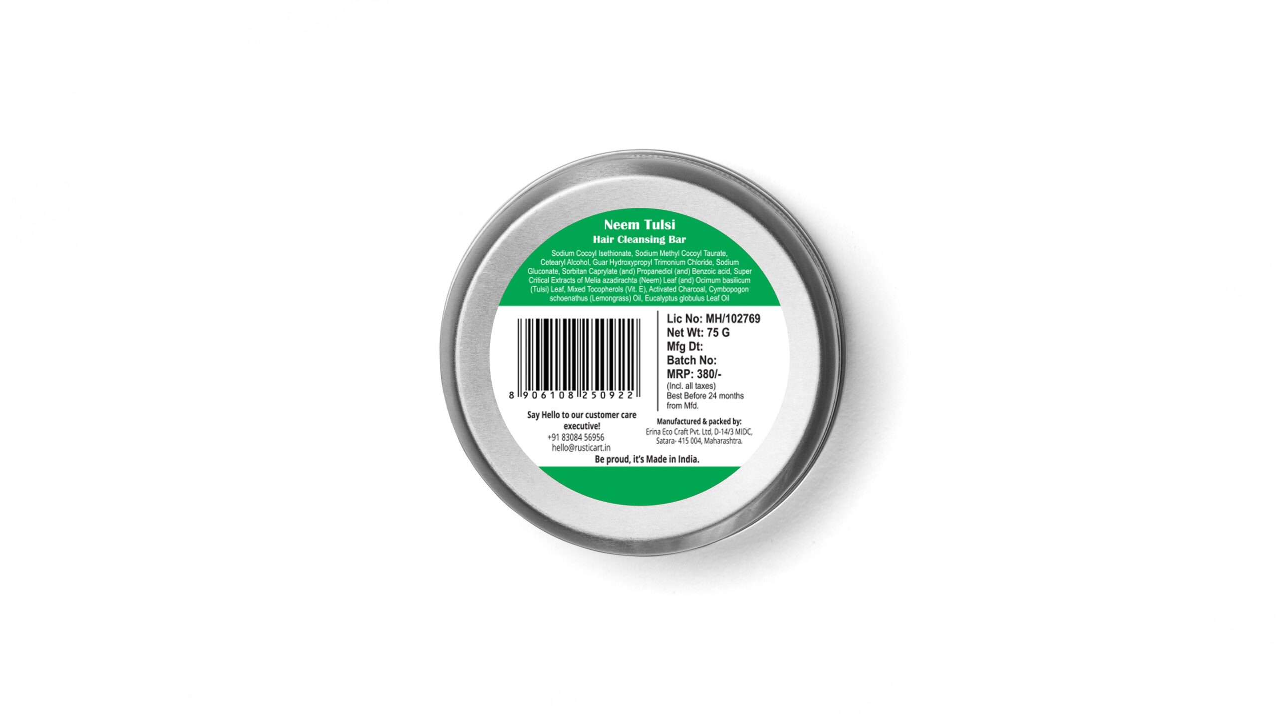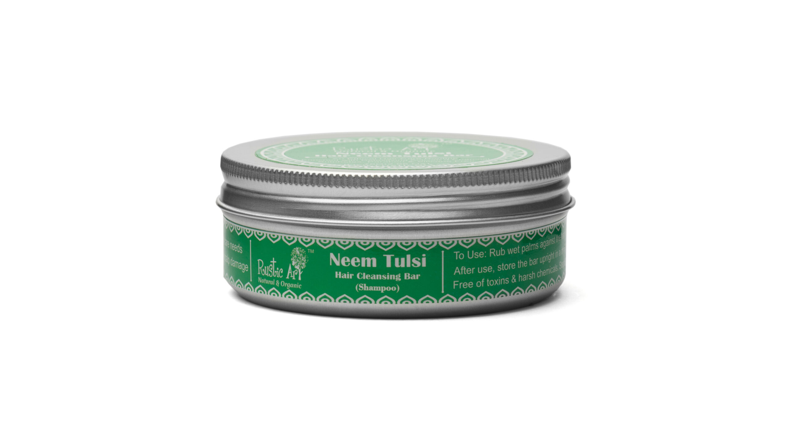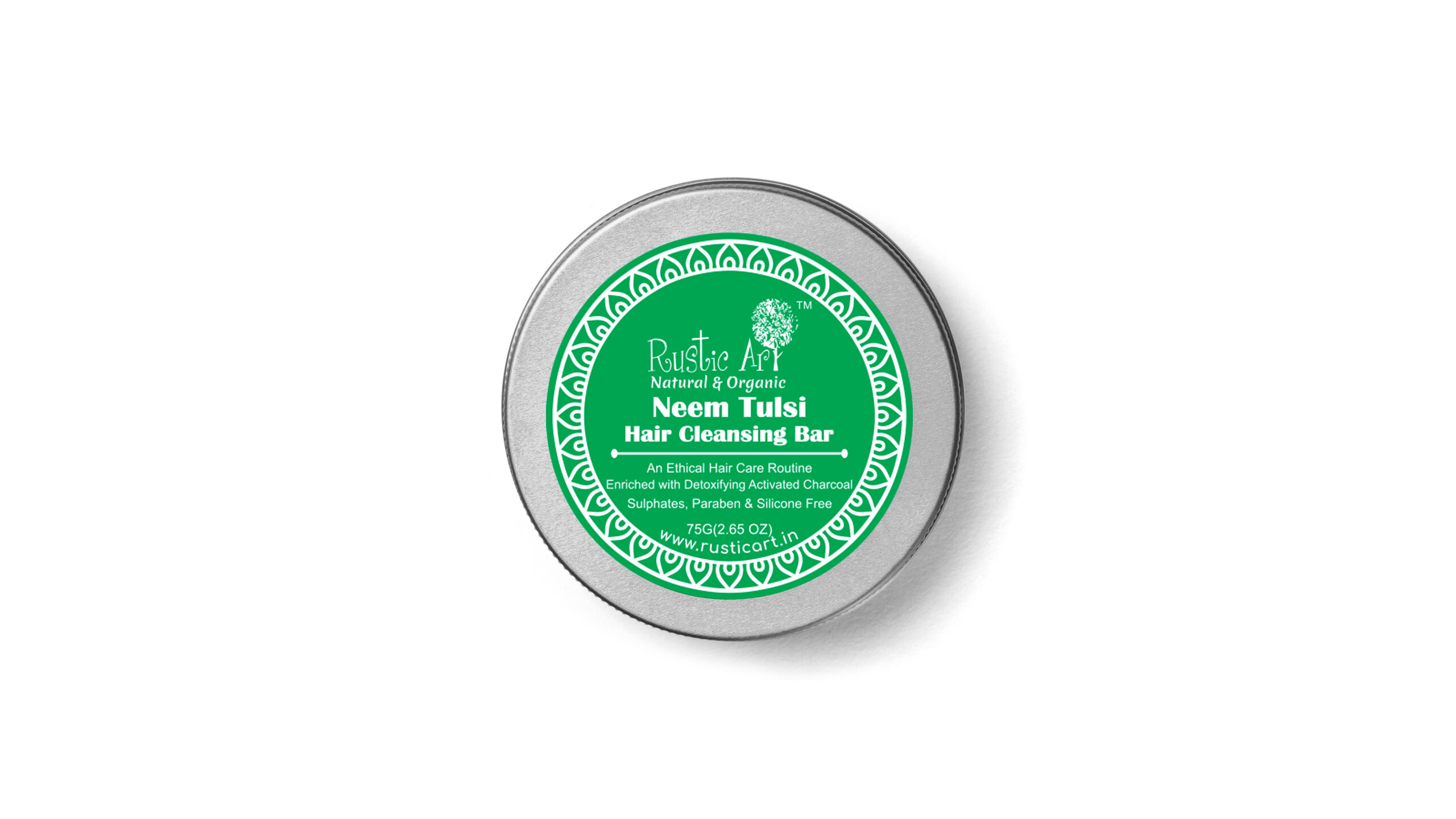 Rustic Art Neem Tulsi hair cleansing bar is the true worship your hair deserves. Neem-Tulsi protects your hair and scalp of any possible damage, and further repairs the previously damaged hair. Activated charcoal helps with the deep cleansing while balancing the scalp oils. This keeps the scalp healthy, forming a strong foundation for the hair. Lemongrass & eucalyptus combo helps relieve any itching, dandruff and irritation of the scalp, thus, being a perfect shampoo for your hair