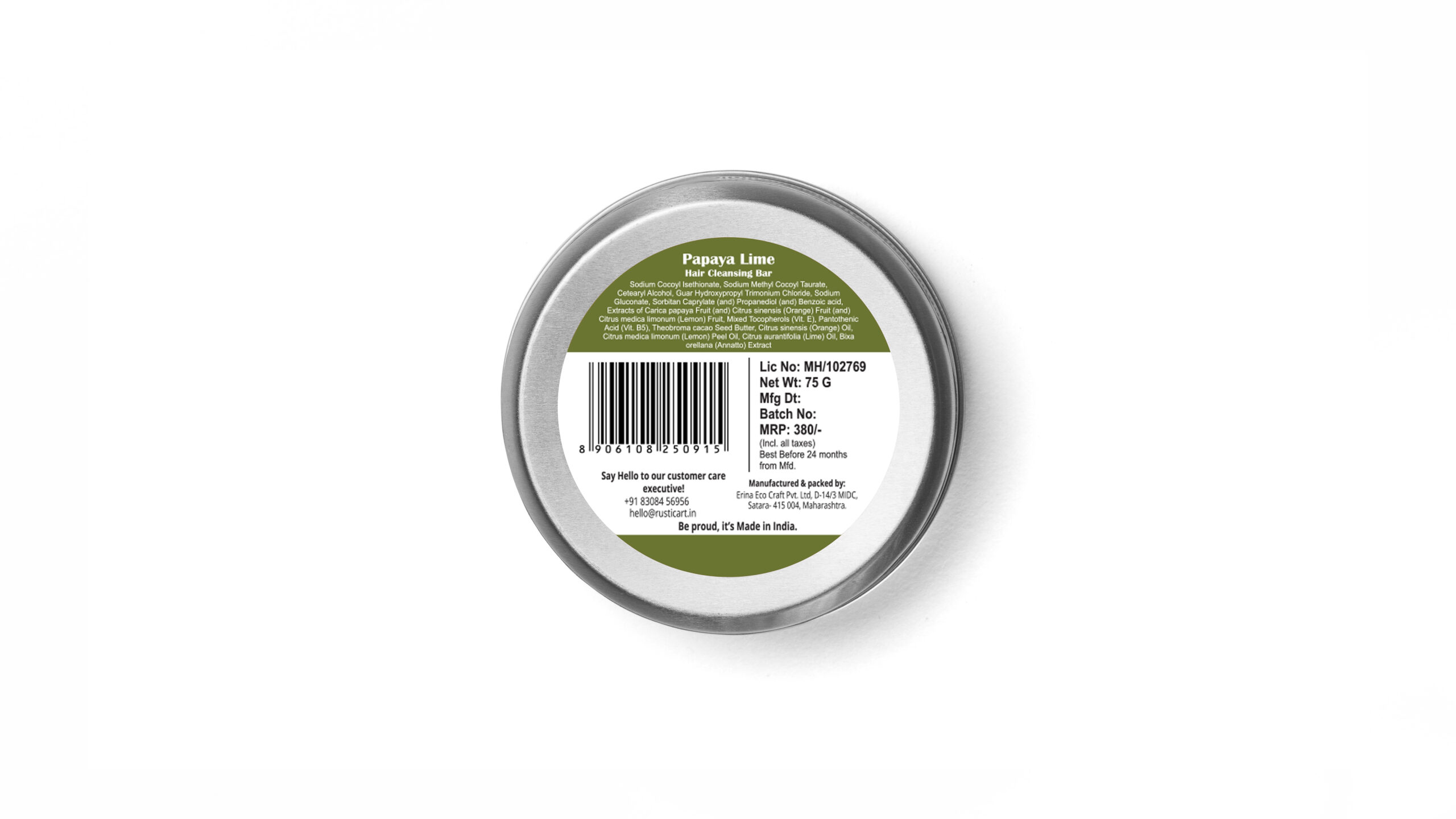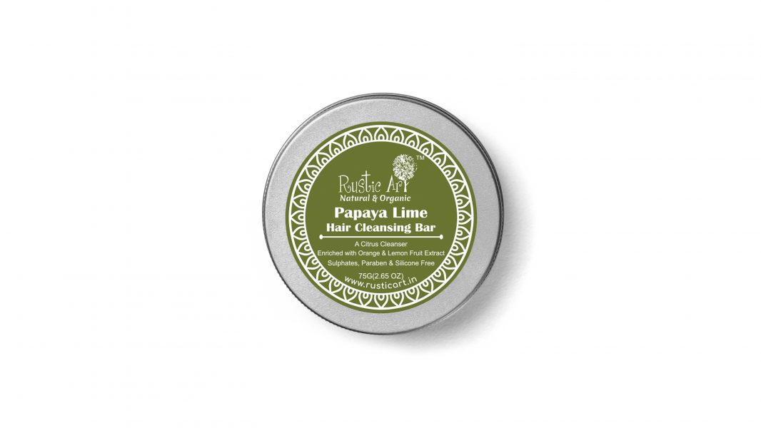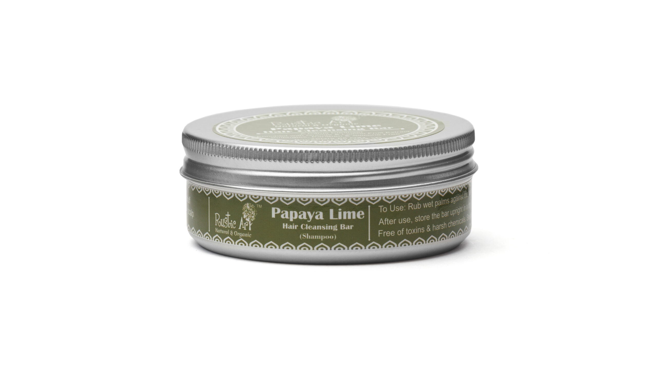 Rustic Art Papaya Lime hair cleansing bar is filled with citric cleansers and fragrances to give you a lime and lemony hair wash experience. Papaya, lime, orange and lemon create an acidic environment for deep cleansing of the hair and scalp. Together, they prevent dandruff and alleviate the oily scalp. Cocoa Seed butter a silky texture to the hair while nourishing it and keeping it tangle free. A mix of Vit E, Vit B5 & Annatto Extract help restore hair health & texture that would make you fall in love with your hair, all over again