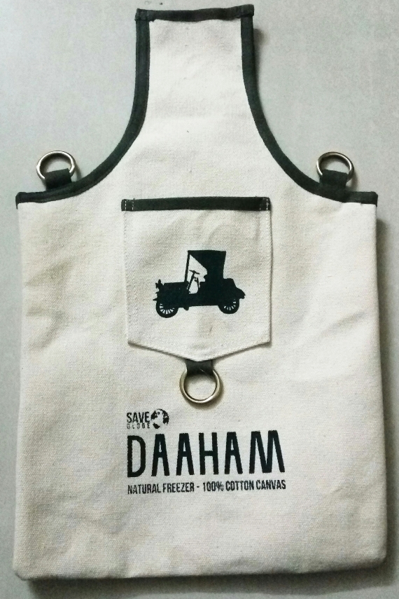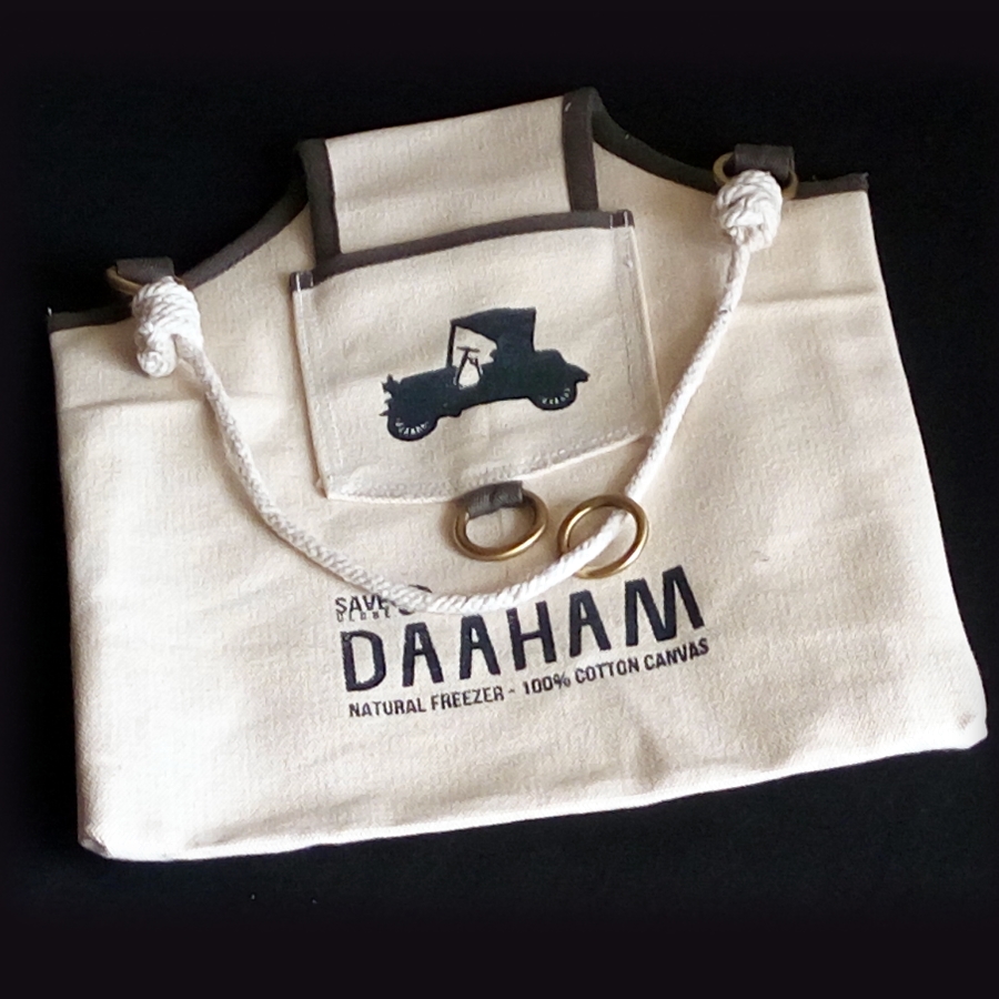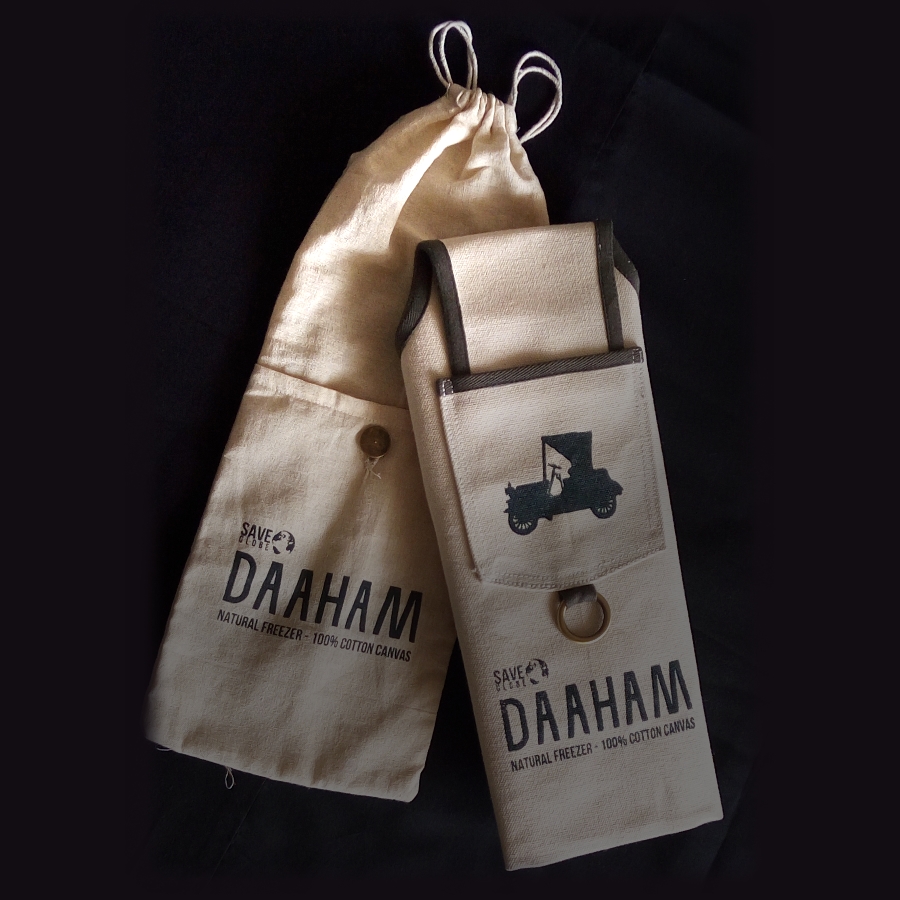 – Daaham – A cotton canvas water bag with brass colored rings and rope with ring to fix it any car, bike and handle to carry with hand.