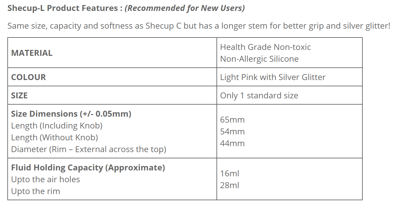 Shecup L(Longer stem for better grip) is a soft menstrual cup is made of high-quality health grade silicone. It is recommended for new users. It is perfectly designed to suit women bodies at different menstruating ages as it is both high or a low cervix compatible and regardless of maternity (Pre/Post). Certified by the US pharmacopeia and is also recommended by senior gynaecologists.