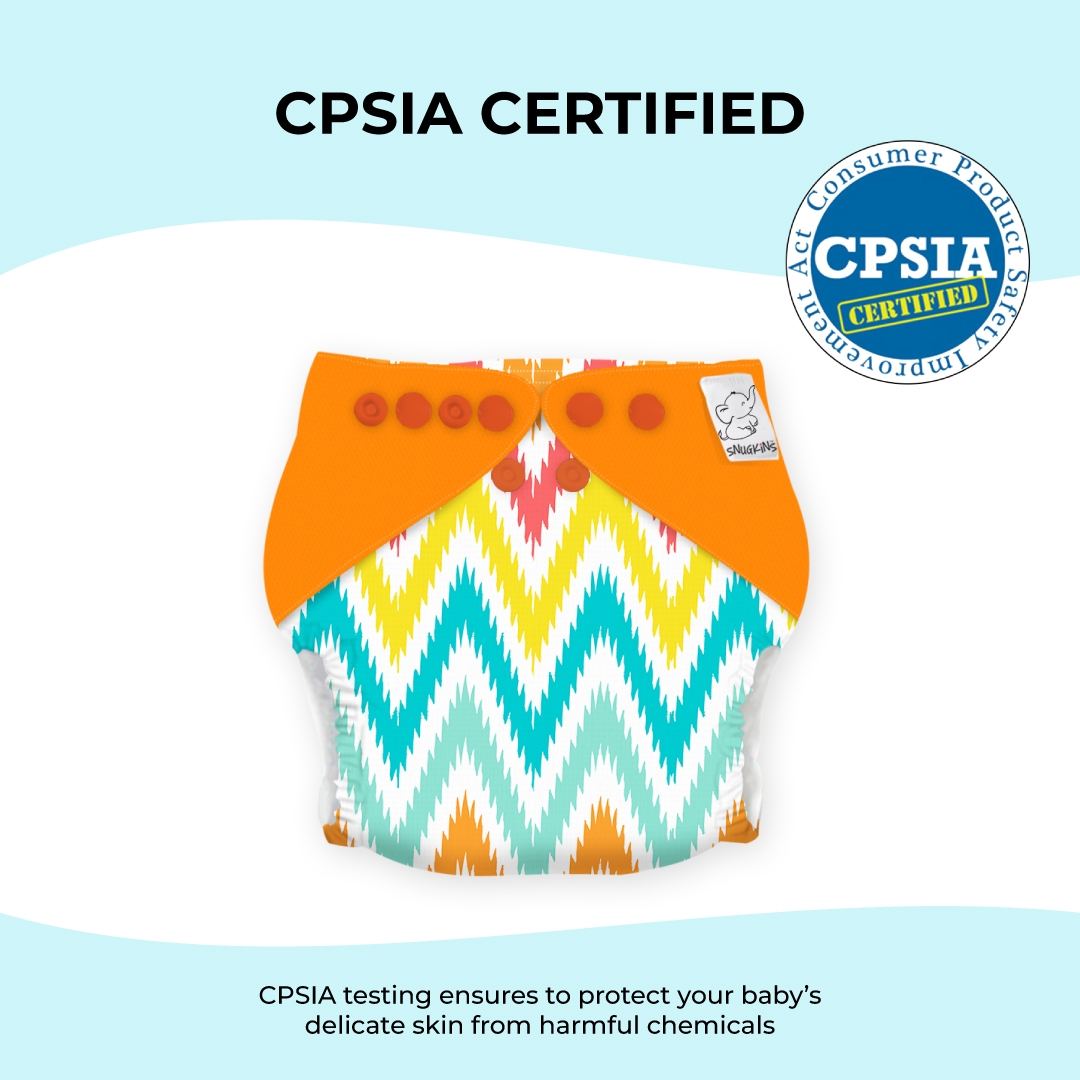 Snugkins Cloth Diapers are CPSIA tested and certified. CPSIA stands for Consumer Product Safety Improvement Act. This means that our cloth diapers are safe from harmful chemicals and metals, and in compliance with all applicable children’s product safety rules enforced by the Consumer Product Safety Commission (CPSC).