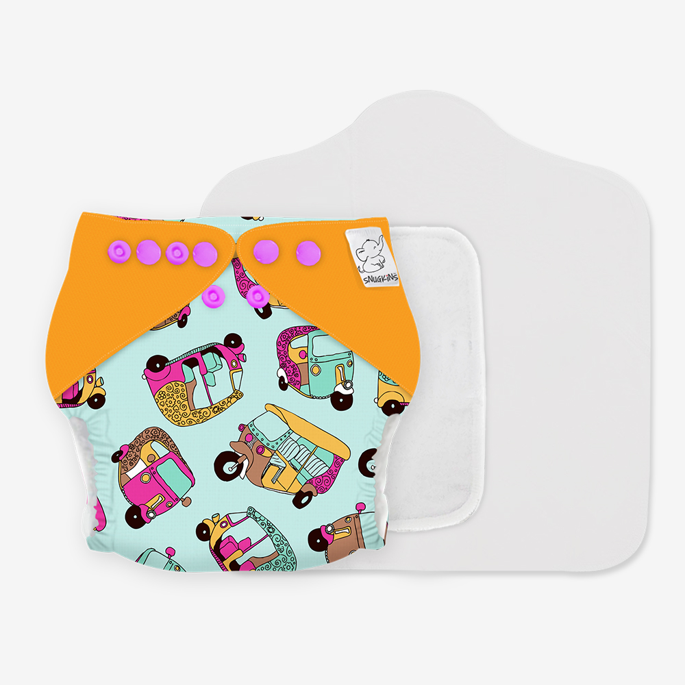 01 Snugkins -New Age Diaper (Tuk Tuk) consisting of 1 Wet-Free Organic Cotton Prefold Pad and 1 Booster Pad.