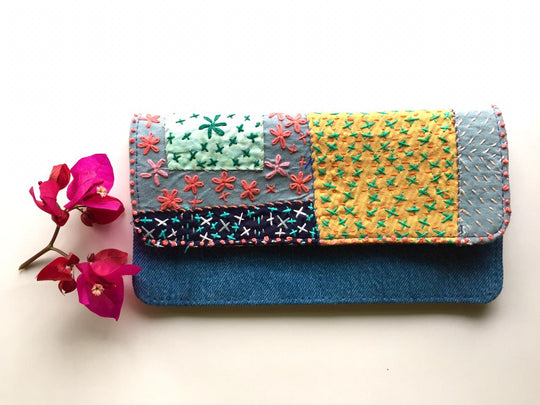 Upcycled denim wallet adorned with detailed embroidery, inspired by the ancient Japanese stitching technique called Sashiko.