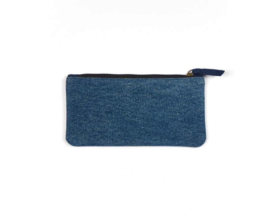 Upcycled denim vanity pouch adorned with Colourful Patch work applique. This pouch is made from denim and small pieces of cotton fabric scraps that is hand-appliqued together by our team of women crafters to give its distinct and exquisite look. This pouch is great to use as a stationery case, utility pouch or even a make-up bag.